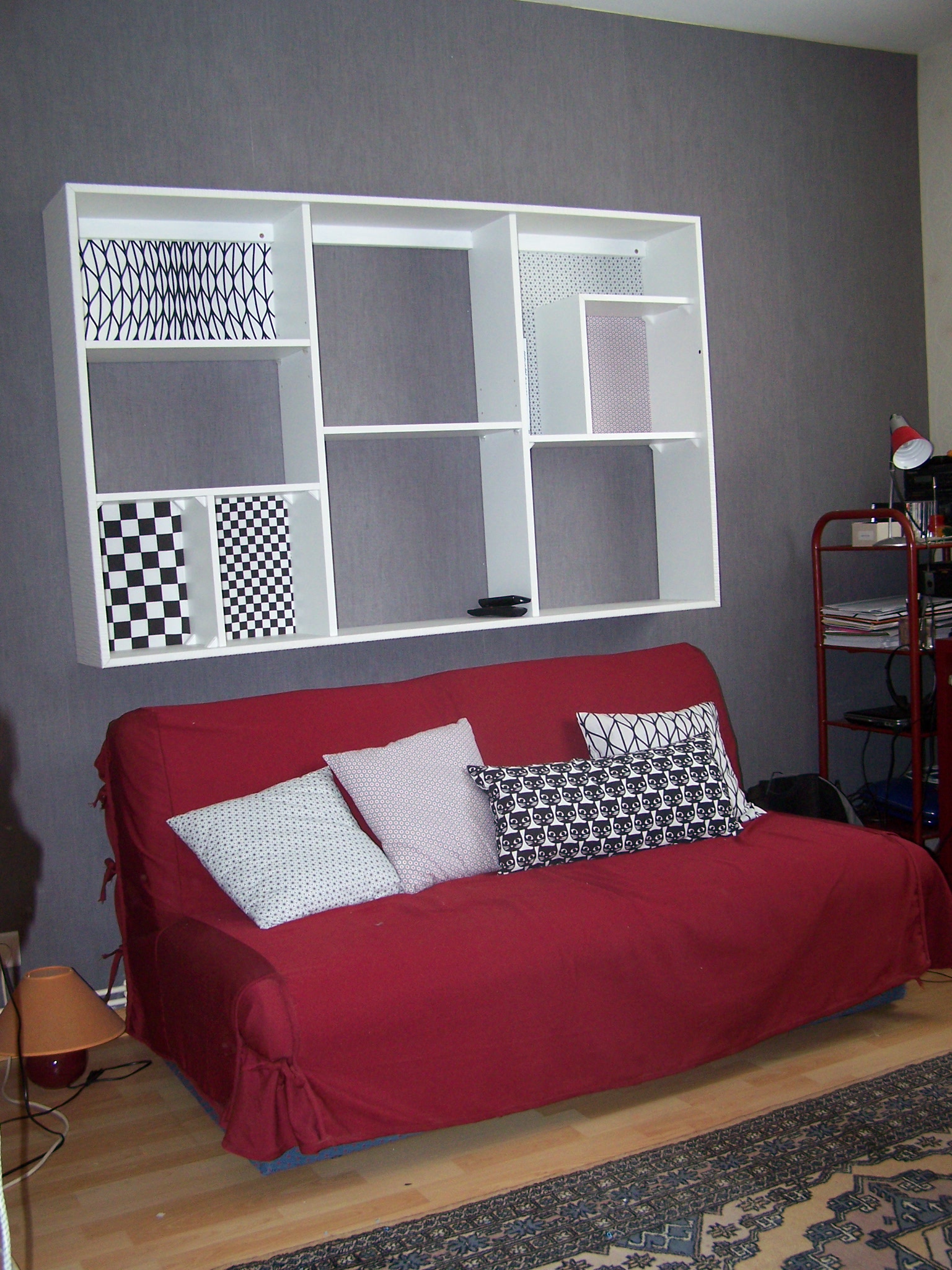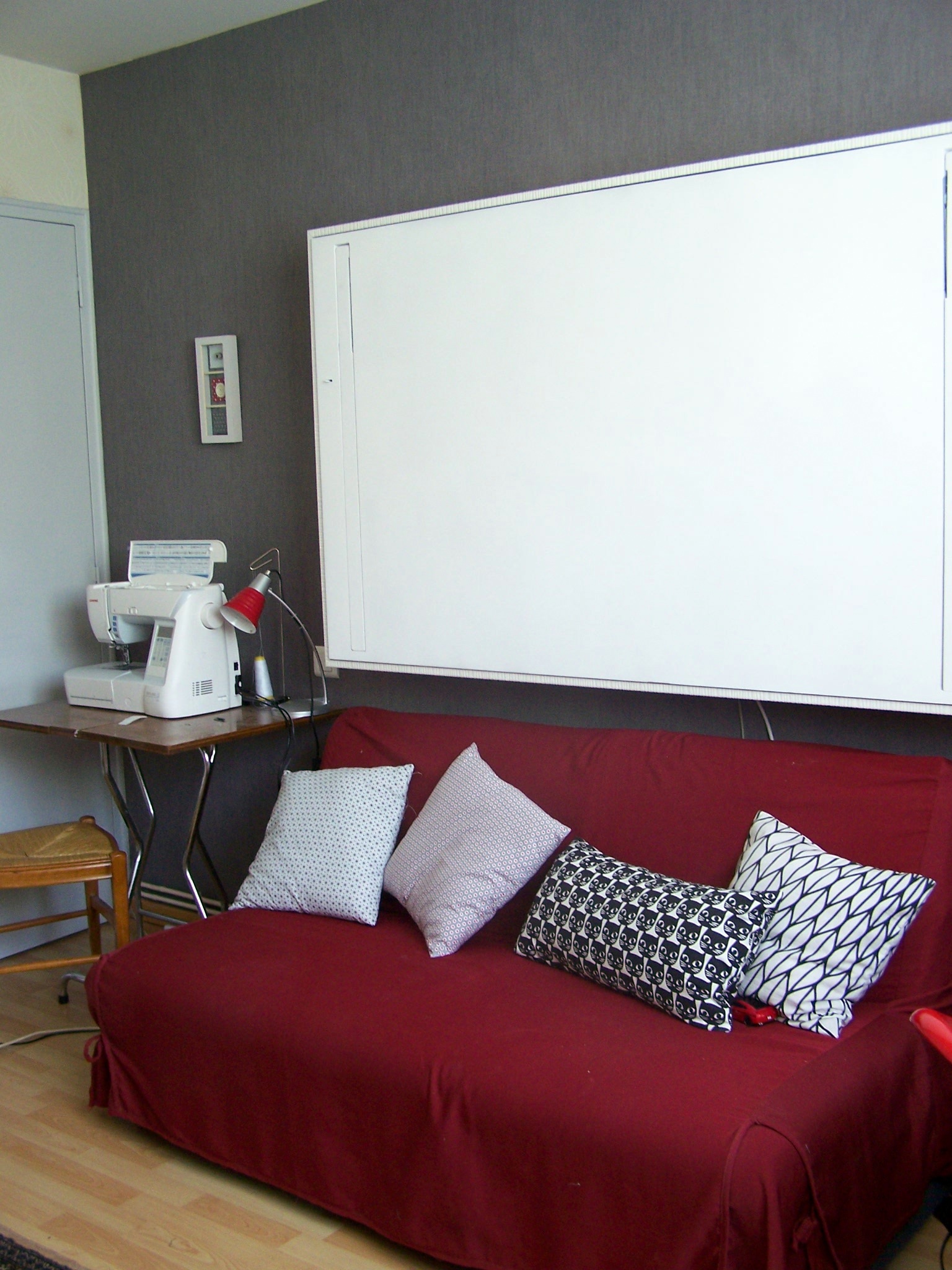 Et voilà c’est chose faite. Rappelez vous la problématique de cette pièce : elle sert également de chambre d’ami et de bureau pour moi. Donc la table ne peut rester à demeure, il faut qu’elle soit escamotable. C’est décidé, elle se relèvera au dessus du canapé.