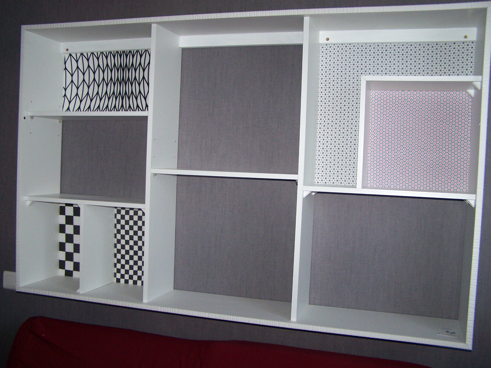 Pour agrémenter ce meuble, je pose des panneaux de tissus au fond du meuble dans les même tissus que ceux utilisés pour les coussins. Je laisse malgré tout apparaître la tapisserie par endroit pour que cette déco ne soit pas trop présente.